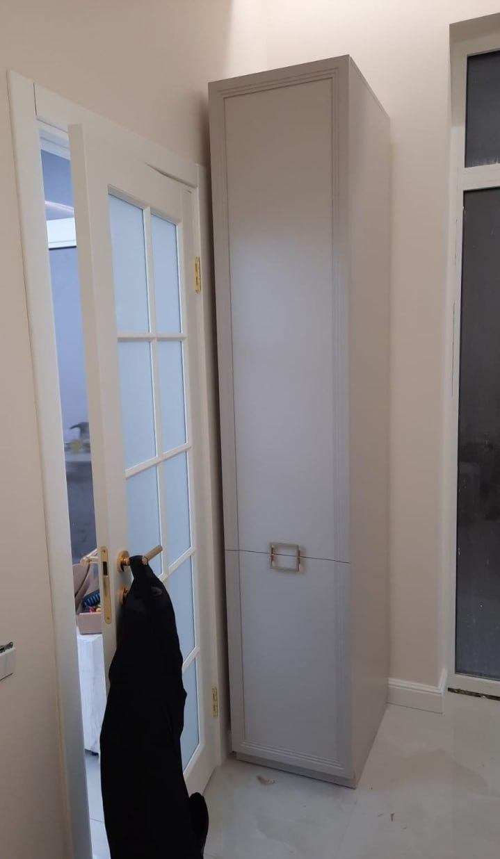 - За фасадом верхней секции — полка ЛДСП и штанга для одежды;