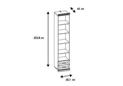 - Верхнее отделение — открытое (без фасада) с тремя съемными полками ЛДСП, в нижнем отделении — два выдвижных ящика;